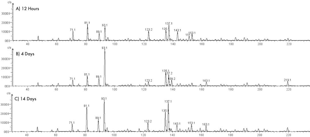 圖2:(A) 發(fā)酵開(kāi)始的12小時(shí),(B) 4天,以及 (C) 14天獲取的質(zhì)譜圖