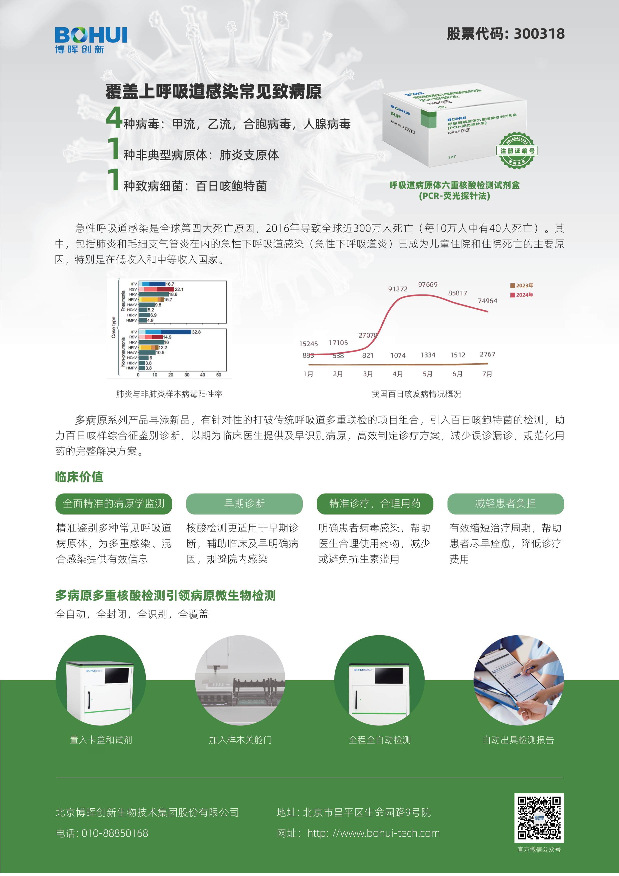 面對潛在的跨境傳播風險,早期精準檢測是防控的關鍵環(huán)節(jié)。博暉創(chuàng)新深耕分子診斷領域,推出的呼吸道病原體六重核酸檢測試劑盒(國械注準 20243401723)可檢測甲型流感病毒、乙型流感病毒、呼吸道合胞病 毒、腺病毒、肺炎支原體、百日咳鮑特菌,這也是目前包含百日咳多聯(lián)檢獨家解決方案,為百日咳及常見呼吸道病原體檢測提供了高效工具。該系列試劑盒采用全封閉泵液模塊結(jié)合熒光定量 PCR 技術,可實現(xiàn)全自動一體化檢測,操作簡便且結(jié)果精準,能快速區(qū)分百日咳鮑特菌與其他呼吸道病原體,助力臨床早期診斷、及時干預。